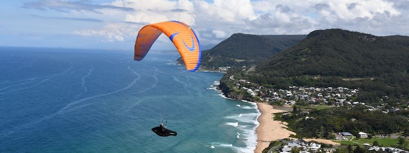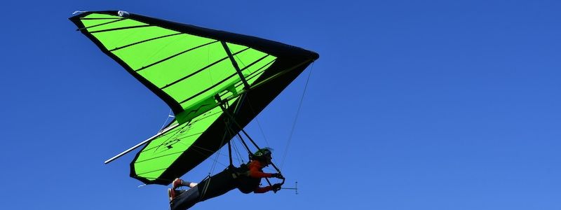 A Hang Glider pilot is suspended in a harness below a rigid wing which is usually an aluminium frame covered in a synthetic sail cloth. They are a little more substantial in structure than a Paraglider, but have better glide performance and can fly in stronger winds.